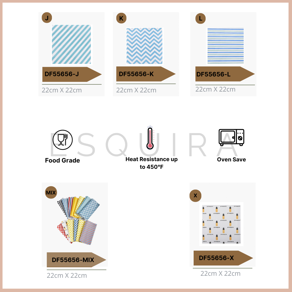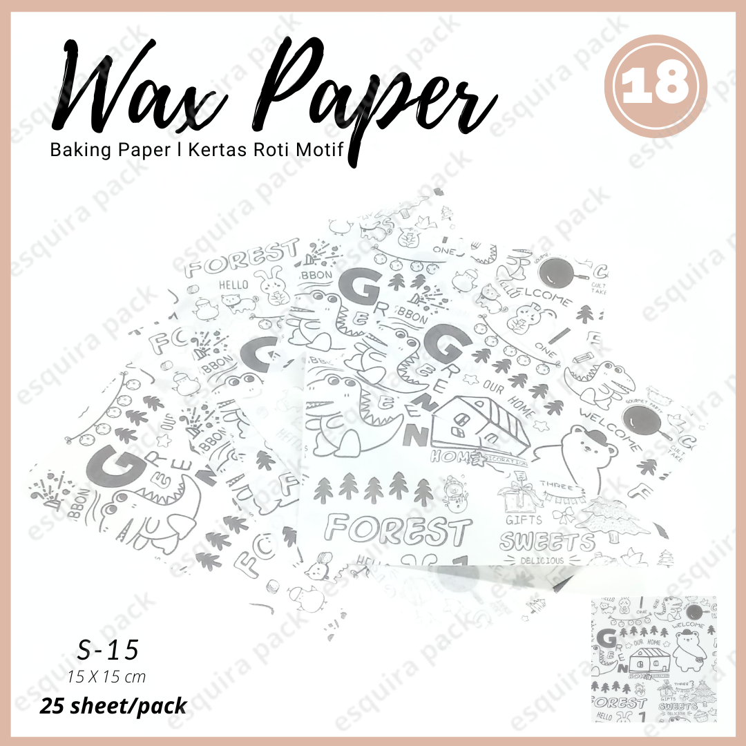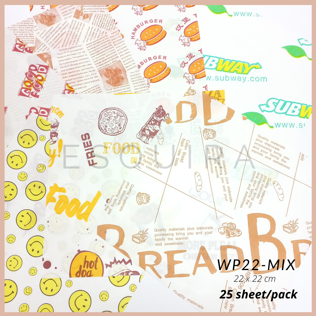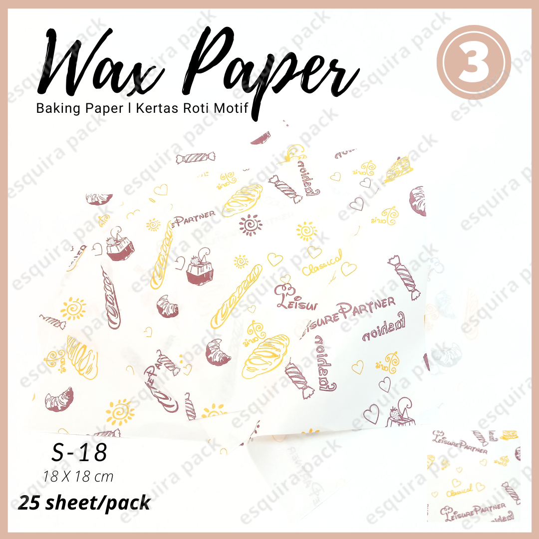 Ukuran : 18 Cm x 18 Cm Tersedia 18 motif dan 3 motif mix Cocok untuk bungkus nasi, roti, cake, burger, kebab dll