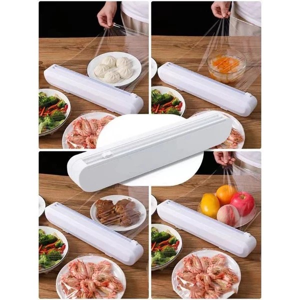 Household Preservative Film Cutter Suitable for : Cling wrap film, Aluminium Foil, Baking paper roll Spesifikasi : 1. Cocok berbagai segala macam bentuk plastik wrap 2. Desain pisau geser dua arah 3. Menghasilkan potongan halus 4. Anti jatuh karena terdapat tentacle dibagian bawah produk Material : Plastic ABS + PP Berat : 256 gram Size : 37.3 Cm X 7.3 Cm X 5.4 Cm Warna : Putih